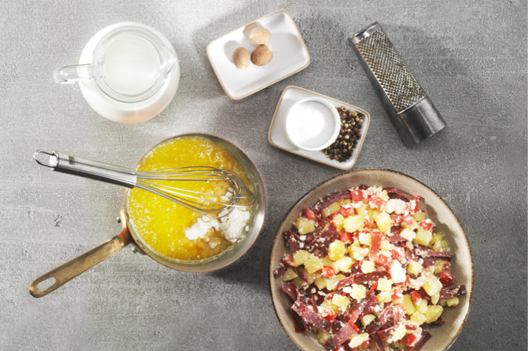 Melt the butter in a pan, add the flour and fry gently, stirring constantly. Gradually add the cold milk, stirring constantly. Season with salt, pepper and nutmeg and stir in the prepared filling.