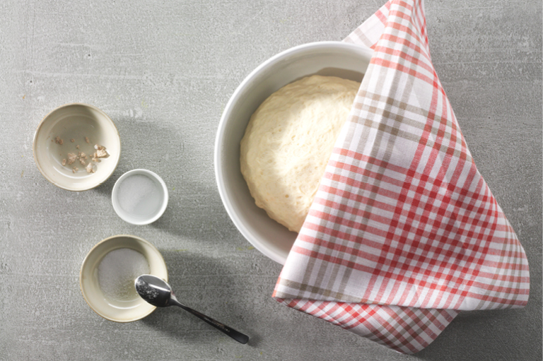Pour the dissolved yeast and oil into a large bowl and knead with the flour to form a smooth dough. Then cover with a kitchen towel and leave to rise for 40 minutes. Meanwhile, preheat the oven to 220 degrees Celsius on the lower top setting.