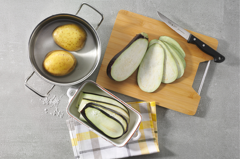 Auberginen längs in dünne Scheiben schneiden, 30 min in Salzwasser legen. Die Kartoffeln mit Schale gar kochen.